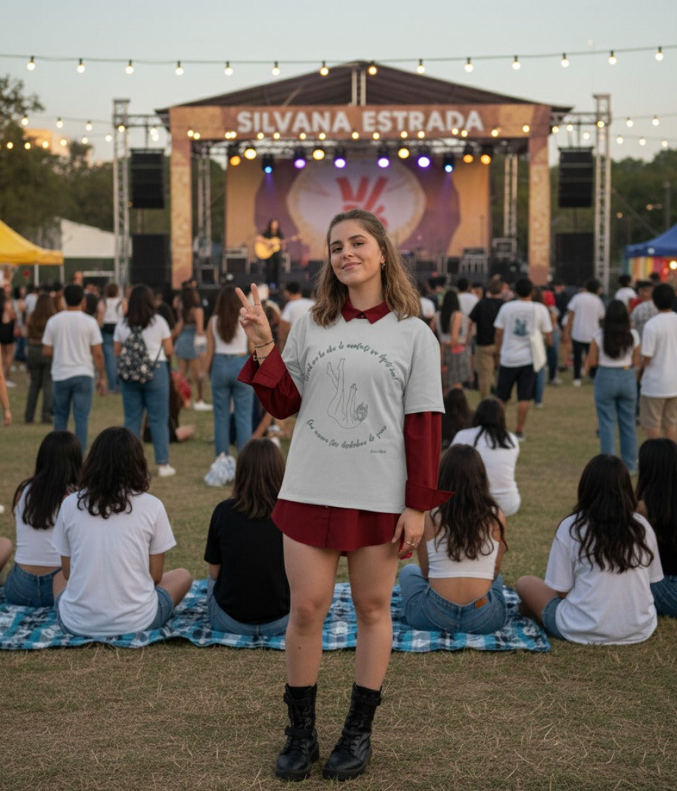 Con la frase de Silvana Estrada "¿Cuál era la idea de aventarte sin dejarte caer? Qué manera tan desoladora de querer", esta camiseta captura la vulnerabilidad y la intensidad de un amor que duele.